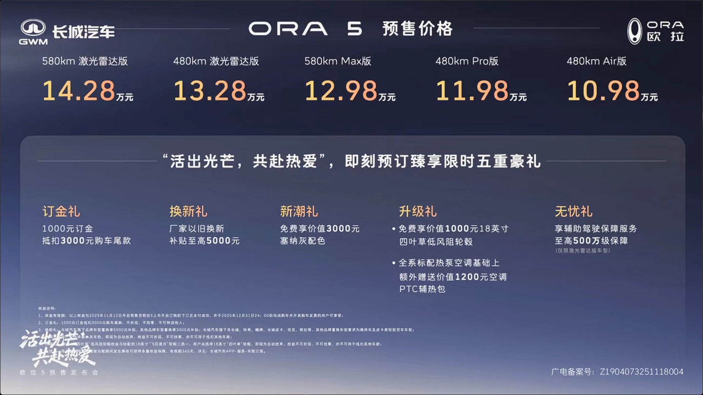 IT之家 11 月 12 日音信,长城欧拉旗下首款纯电 SUV 欧拉 5 现已开启预售,新车定位紧凑型 SUV,不绝“猫系”家眷野心话语,领有激光雷达,复旧高阶援助驾驶功能,可选 480km 和 580km 两种续航版块,预售价 10.98 万元起。
